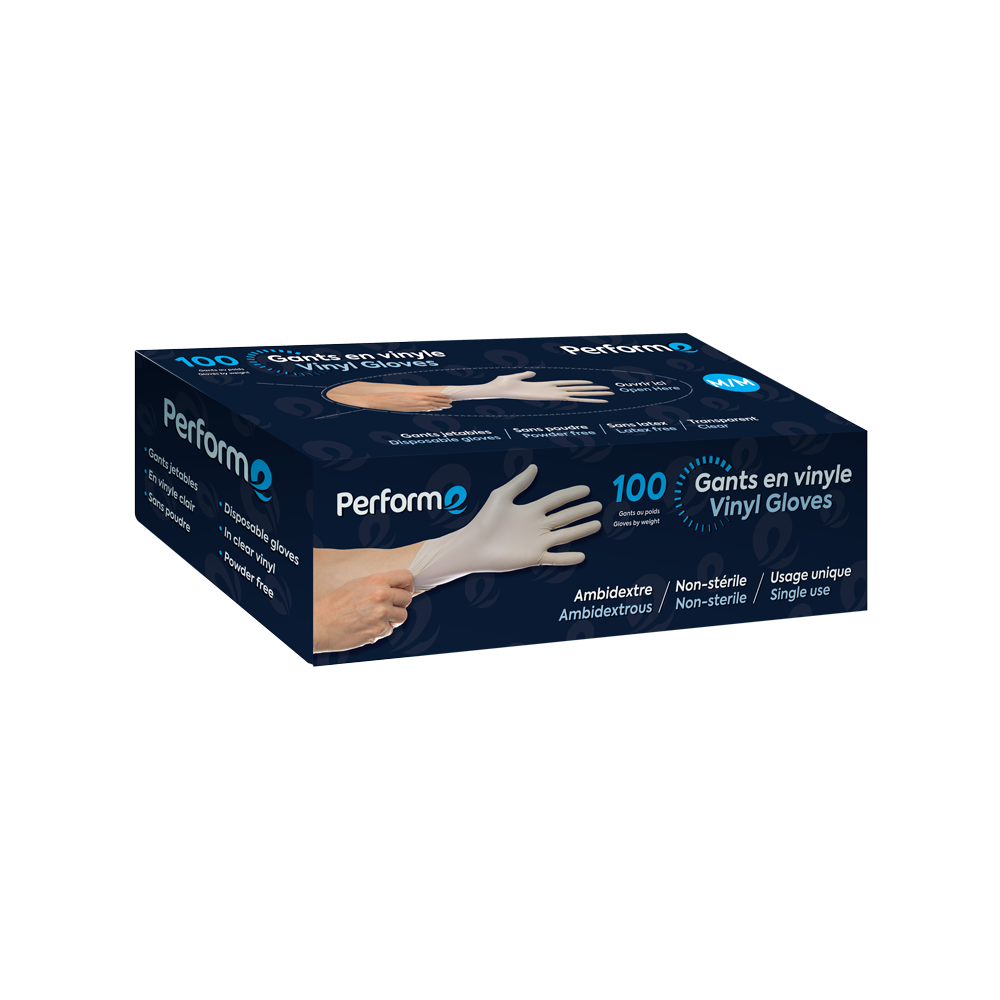 Gants de vinyle jetables transparent, grandeur Moyen. 100 gants par boîtes. Sans poudre.